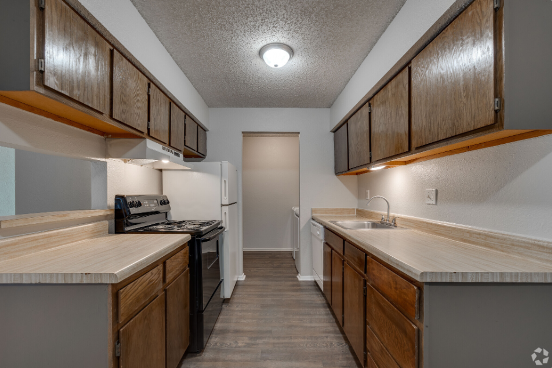 Spacious two bedroom two bathroom apartment home with walk in closets, private patio, large pantry storage, and plank wood flooring.