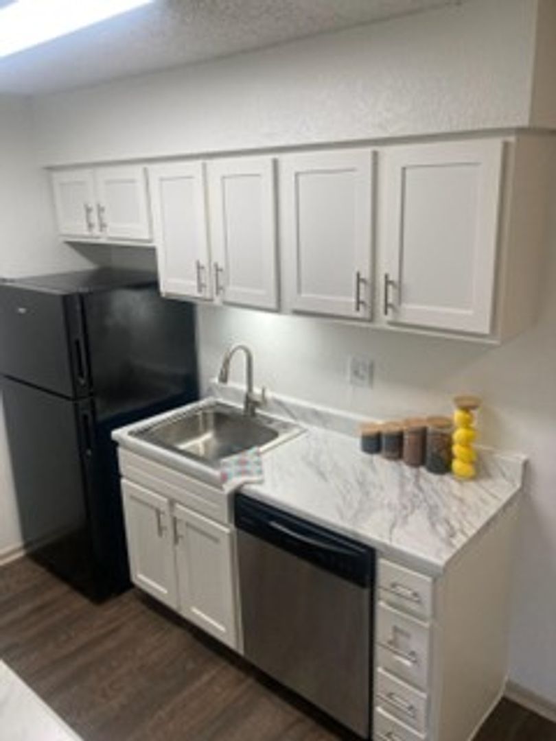 Our largest one bedroom, one bathroom floorplan with walk in closet, open kitchen, and private patio! Enjoy the convenience of first floor living in a beautiful setting with plank wood flooring, new appliances, LED fixtures, and white shaker style cabinets!